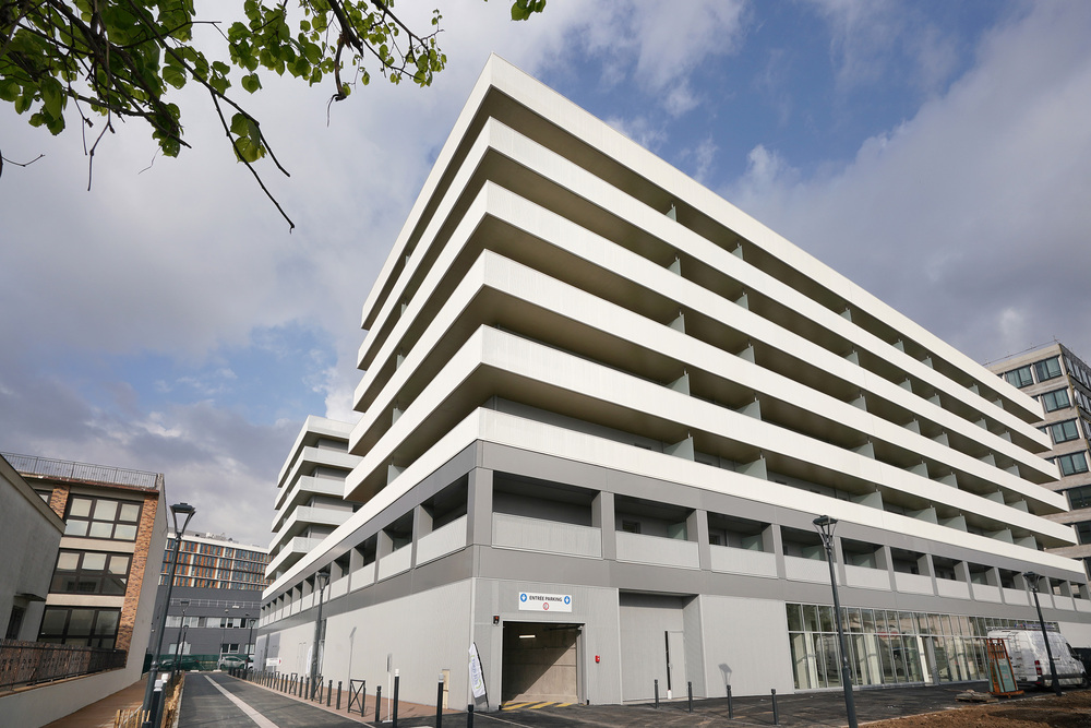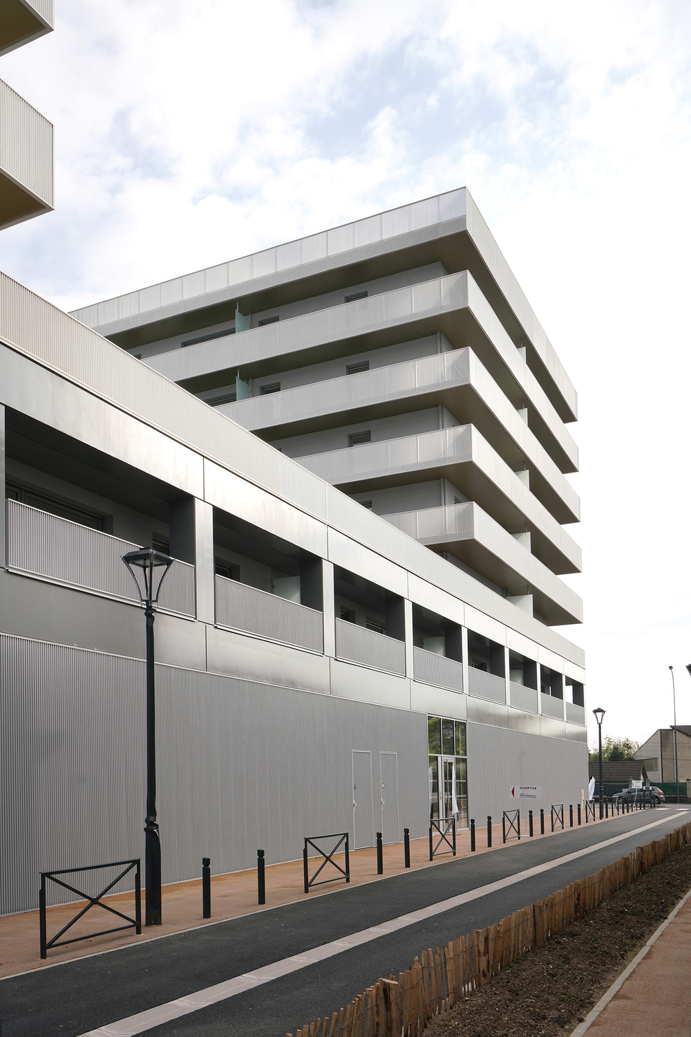La résidence présente une silhouette élégante, rythmée par des balcons filants, rehaussés avec légèreté par des garde-corps en métal perforé de couleur blanche. Elle affirme sa personnalité à travers son architecture dans ce paysage citadin.